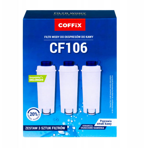 Wysokiej jakości zamiennik filtrów do ekspresów DeLonghi – odpowiednik DLS C002 i SER 3017. Skutecznie oczyszcza wodę z drobin mechanicznych, metali ciężkich, pestycydów i wapnia. Specjalna formuła wkładu zapewnia 20% lepszą filtrację wody, przeciwdziałając osadzaniu się kamienia w ekspresie. Poprawia smak i zapach wody, co znacząco wpływa na aromat kawy.