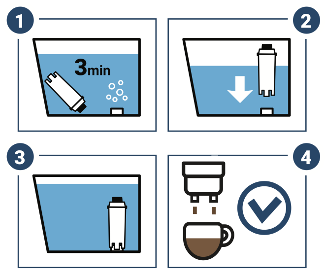 - Zamontuj wypełniony wodą filtr w zbiorniku zgodnie z instrukcją obsługi ekspresu